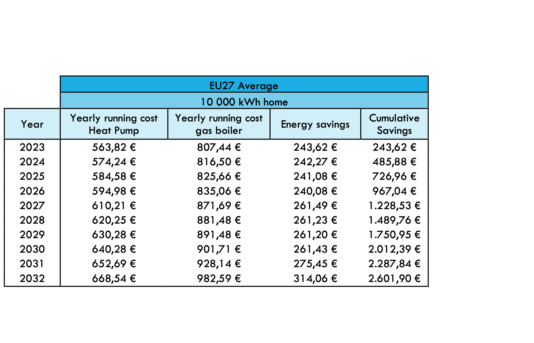 Na základe trhových predpokladov použitých v tomto modeli by malo tepelné čerpadlo, ktoré sa inštaluje ako náhrada plynového kotla používaného na vykurovanie a prípravu teplej pitnej vody, generovať v priebehu predpokladaného obdobia 10 rokov úspory za energiu. Očakáva sa, že tieto úspory sa budú v priebehu času zvyšovať.