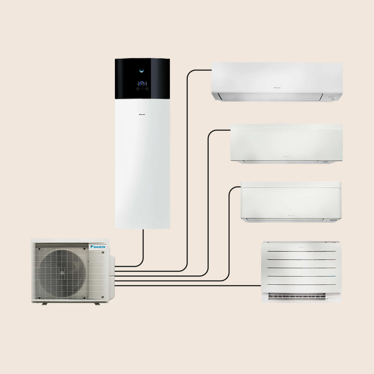 Vykurovanie, chladenie a ohrev vody v domácnosti, a to pripojením jednej vonkajšej jednotky až k štyrom vnútorným jednotkám a zásobníku teplej vody