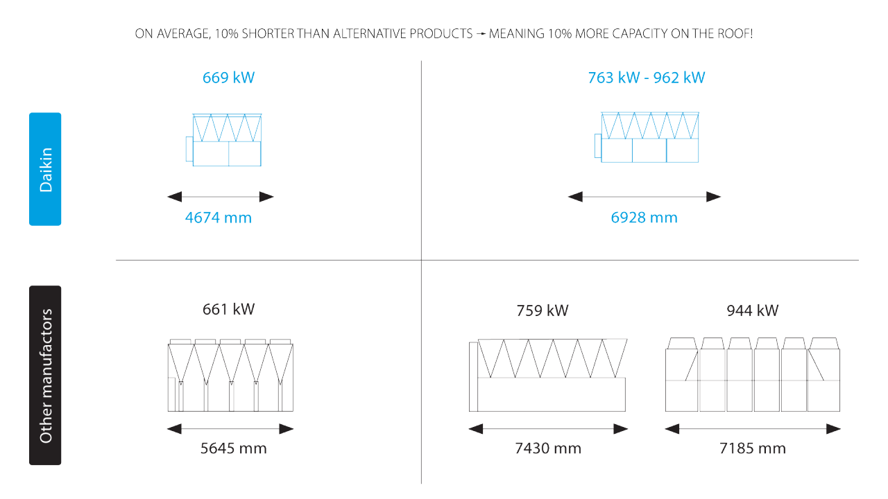 Daikin VFD umožňuje optimálnu prevádzku jednotky, znižuje a kontroluje prevádzkové náklady za každých pracovných podmienok. Vlastný jednoskrutkový kompresor je integrovaný s pomerom premenlivého množstva (VVR), ktorý moduluje kompresný pomer a zvyšuje účinnosť kompresora pri meniacich sa okolitých podmienkach.