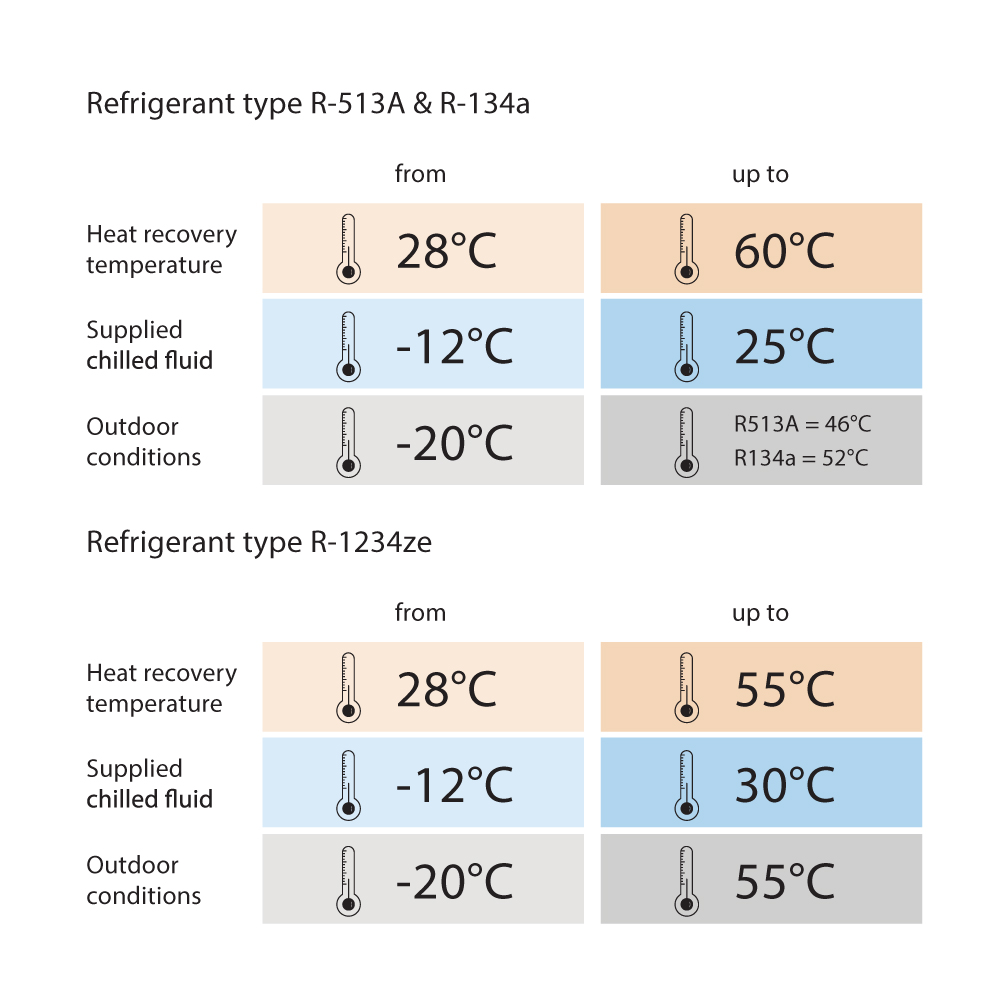 To umožňuje rekuperáciu časti alebo všetkého tepla, ktoré vzniká počas chladiaceho procesu. Tým sa zvyšuje energetická účinnosť a znižujú sa prevádzkové náklady. Pri celkovej rekuperácii tepla je jednotka vybavená ďalším kondenzátorom na každý okruh na prípravu teplej vody. Pri čiastočnej rekuperácii tepla je jednotka vybavená jedným sýtičom pary na každý okruh na prípravu teplej vody. Tento systém rekuperácie tepla umožňuje prípravu teplej vody, ktorú možno použiť na špecifické potreby.