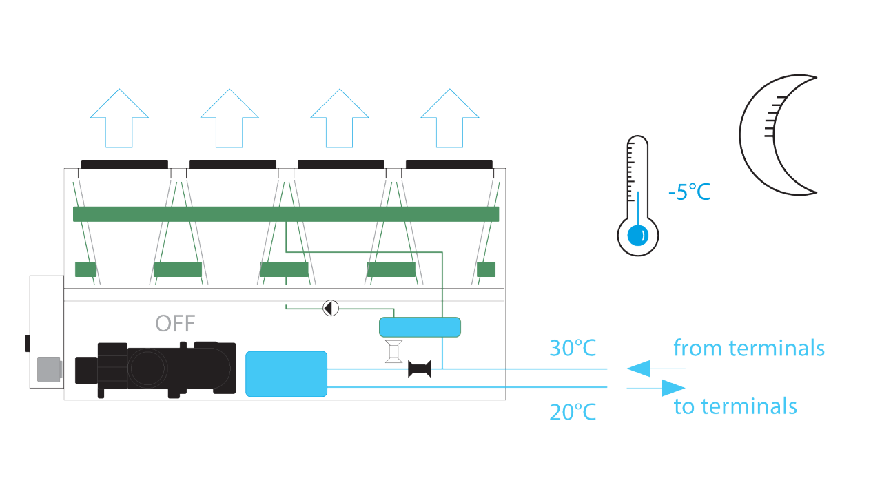Doskový výmenník tepla jednotky vytvára uzavretý okruh s výmenníkom voľného chladenia a vyhradeným čerpadlom. V tomto systéme je glykol uzavretý v uzavretom okruhu. Bezglykolový variant pracuje so systémom „uzavretého okruhu“, ktorý poskytuje kompatibilné a účinné riešenie pre aplikácie, kde sa uprednostňuje vyhnúť sa používaniu glykolu. Medzi jeho výhody patrí aj výrazná úspora nákladov, pretože vďaka tomu, že sa v systéme zákazníka nepoužíva glykol, je jednoduchšia jeho údržba a zvyšuje sa celková účinnosť. V priemyselných procesoch znižuje riziko kontaminácie a zabezpečuje, aby nebola ohrozená kvalita výrobkov.